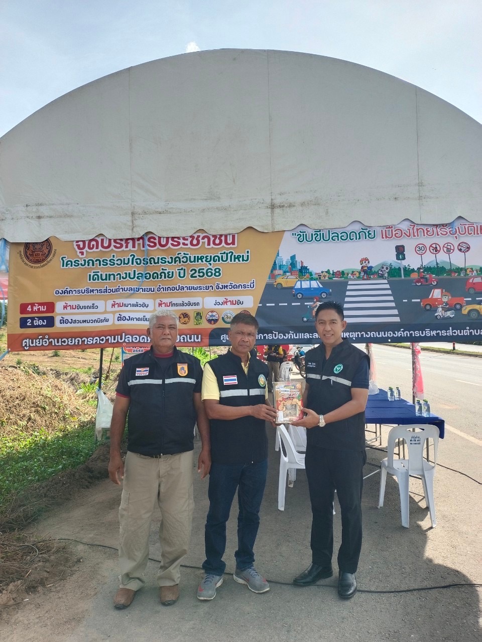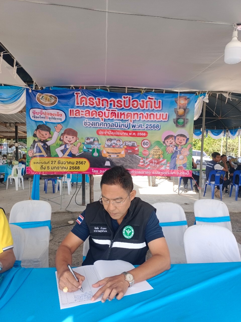 วันที่ 1 มกราคม 2568 นายชิงชัย บัวทอง สาธารณสุขอำเภอปลายพระยา พร้อมด้วยเจ้าหน้าที่ ได้รับหมายจากนายศรณ์ รักรงค์ นายอำเภอปลายพระยา ให้ออกตรวจเยี่ยมเจ้าหน้าที่ปฏิบัติงานป้องกันและลดอุบัติเหตุทางถนนช่วงเทศกาลปีใหม่ 2568 เฝ้าระวัง 10 วันอันตรายตั้งแต่วันที่ 27 ธันวาคม 2567 – 5 มกราคม 2568 ณ จุดตรวจหลัก จุดบริการประชาชน และด่านชุมชนดังนี้